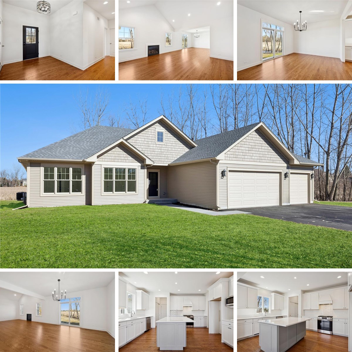 Everyone is searching for a ranch in Terrace Lakes-now is your chance! This custom-built, brand-new ranch home offers luxury living in a premium location backing to a treelined nature preserve, with no neighbors behind, beside, or directly in front. As you arrive, a welcoming covered front porch leads into a large, open foyer with custom lighting. Inside, you'll immediately notice soaring ceilings, gleaming hardwood floors, and an open floor plan designed for today's lifestyle. High-end finishes are everywhere, including designer light fixtures, recessed LED lighting, and a beautiful Heatilator fireplace. The spacious island kitchen is the heart of the home, featuring custom cabinetry, quartz countertops, custom tile work, recessed lighting, and a large walk-in pantry conveniently located off the mudroom and garage. The bedroom wing offers three generously sized bedrooms. The hall bath features premium tile work and dual raised vanities, while the private primary suite impresses with vaulted ceilings, a walk-in closet, and a luxury bath with soaking tub, separate oversized shower, and dual custom vanities. A full, fully insulated basement spans the home-ready for your finishing ideas. Completing this exceptional property is a deep three-car garage and extra-wide driveway, all part of this high-quality custom build. Luxury, privacy, and new construction in Terrace Lakes-this one truly stands out.